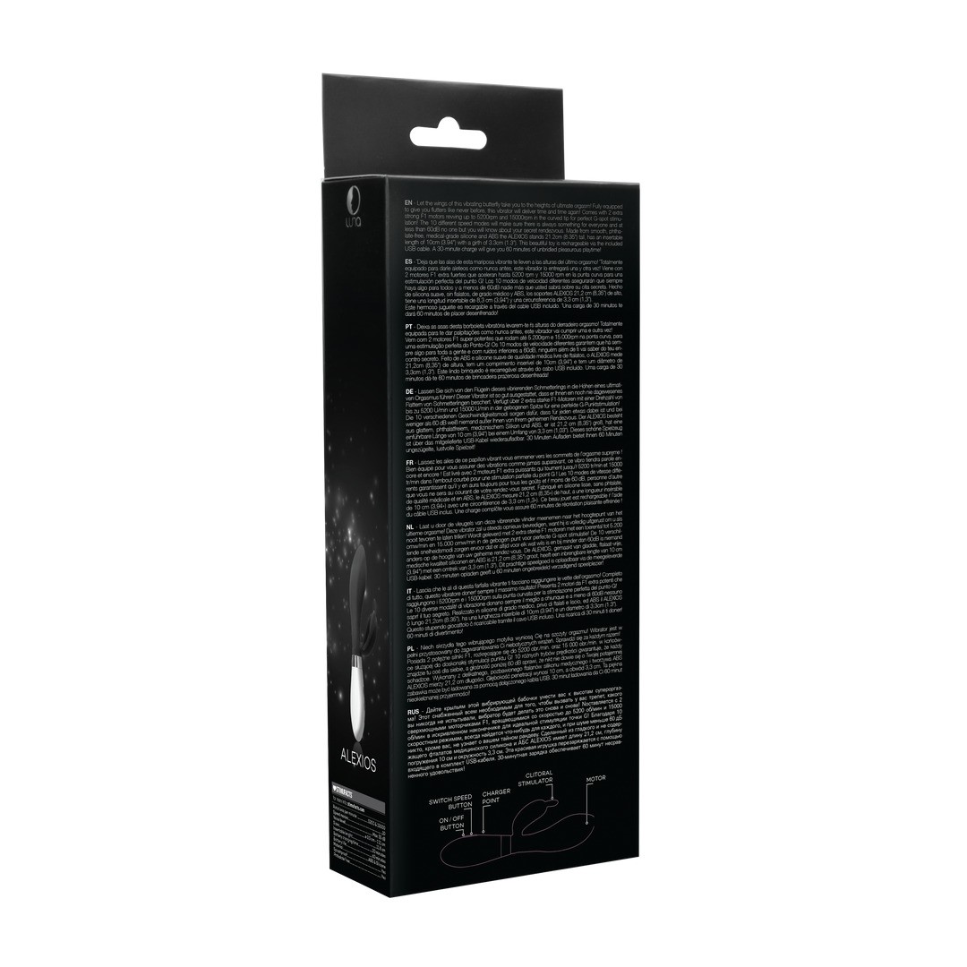Feito em silicone macio, de grau médico, sem ftalatos, e ABS, o ALEXIOS mede 21,2 cm de altura, possui 10 cm de comprimento inserível e um diâmetro de 3,3 cm.