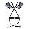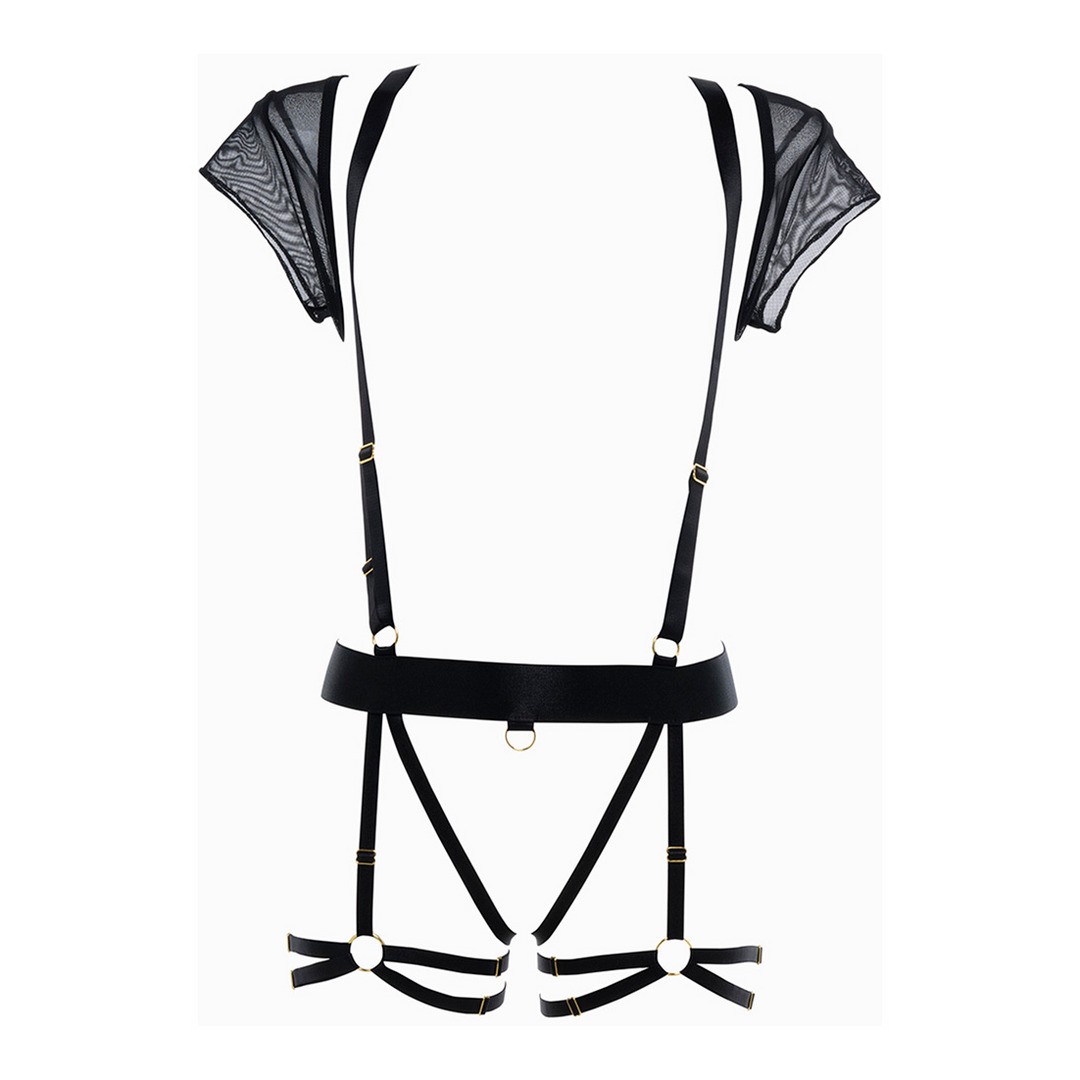 Para o look fashionista e sedutor. Definitivamente não é para o Zoom, este é apenas para ser visto pessoalmente. O top de bolero em malha com tiras ajustáveis à frente e atrás funde-se numa cueca totalmente aberta com tiras ajustáveis. Para adoçar ainda mais o visual, as tiras de ligas realçam as ancas com fitas ajustáveis nas pernas.