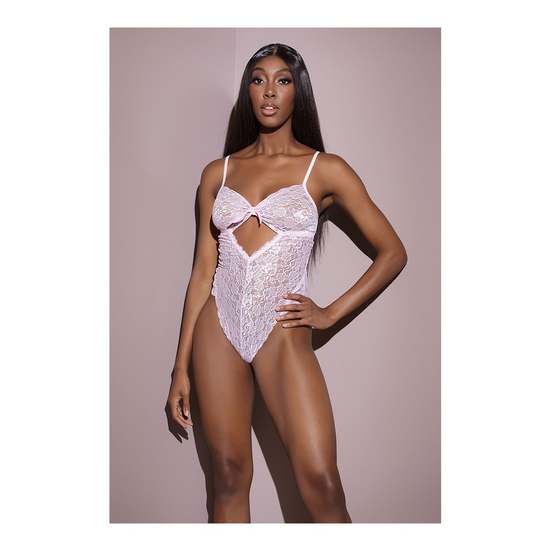 Body em renda rosa com abertura central, que combina sensualidade e elegância num único modelo.