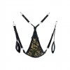 Este baloiço de tecido camuflado foi concebida com uma forma triangular e tecido de camuflagem. Ajusta-se com 3 ou 4 pontos de fixação. Inclui os seguintes acessórios: 4 ganchos com mosquetões metálicos, apoios almofadados para os pés (11 cm de largura) e uma almofada triangular preta (24 x 20 cm).