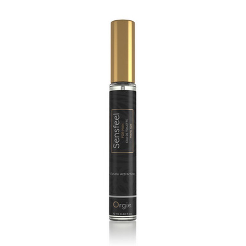 Perfume de viagem de 10 ml Sensfeel for Man, fórmula exclusiva da Orgie com o ingrediente ativo de base natural Sensfeel for Him™, um potenciador de feromônios que pode aumentar a atratividade dos homens através da ação simultânea de dois dos seus componentes: Forskolin, que aumenta a expressão da enzima 3 beta-HSD, que aumenta a produção do feromona sexual masculino - androstadienona, e teaflavinas, que diminuem a atividade da enzima 5-alfa redutase, diminuindo o metabolismo da androstadienona, resultando na sua acumulação.