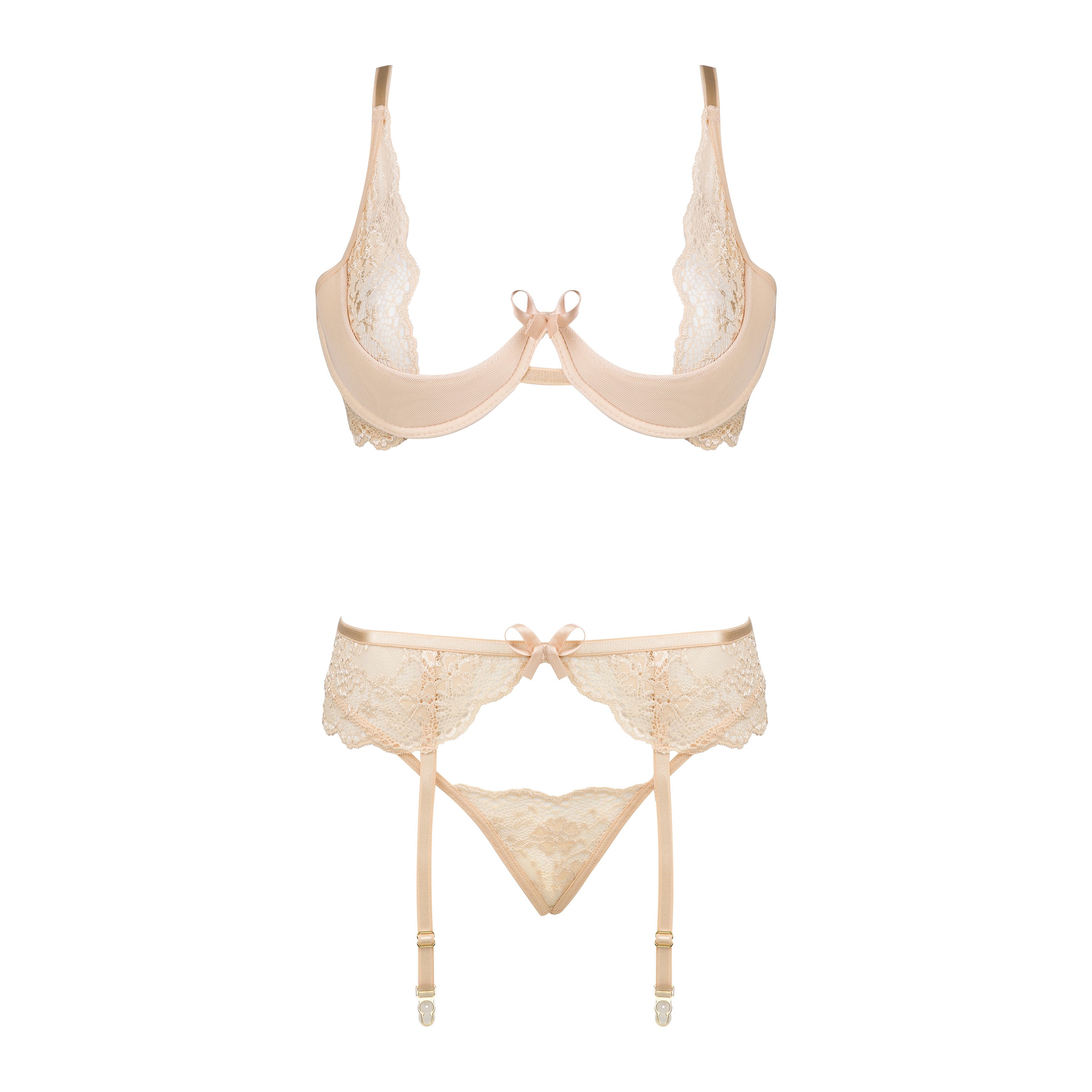 Um conjunto de lingerie clássico em cor nude, composto por um sutiã, cuecas e um cinto de ligas.
