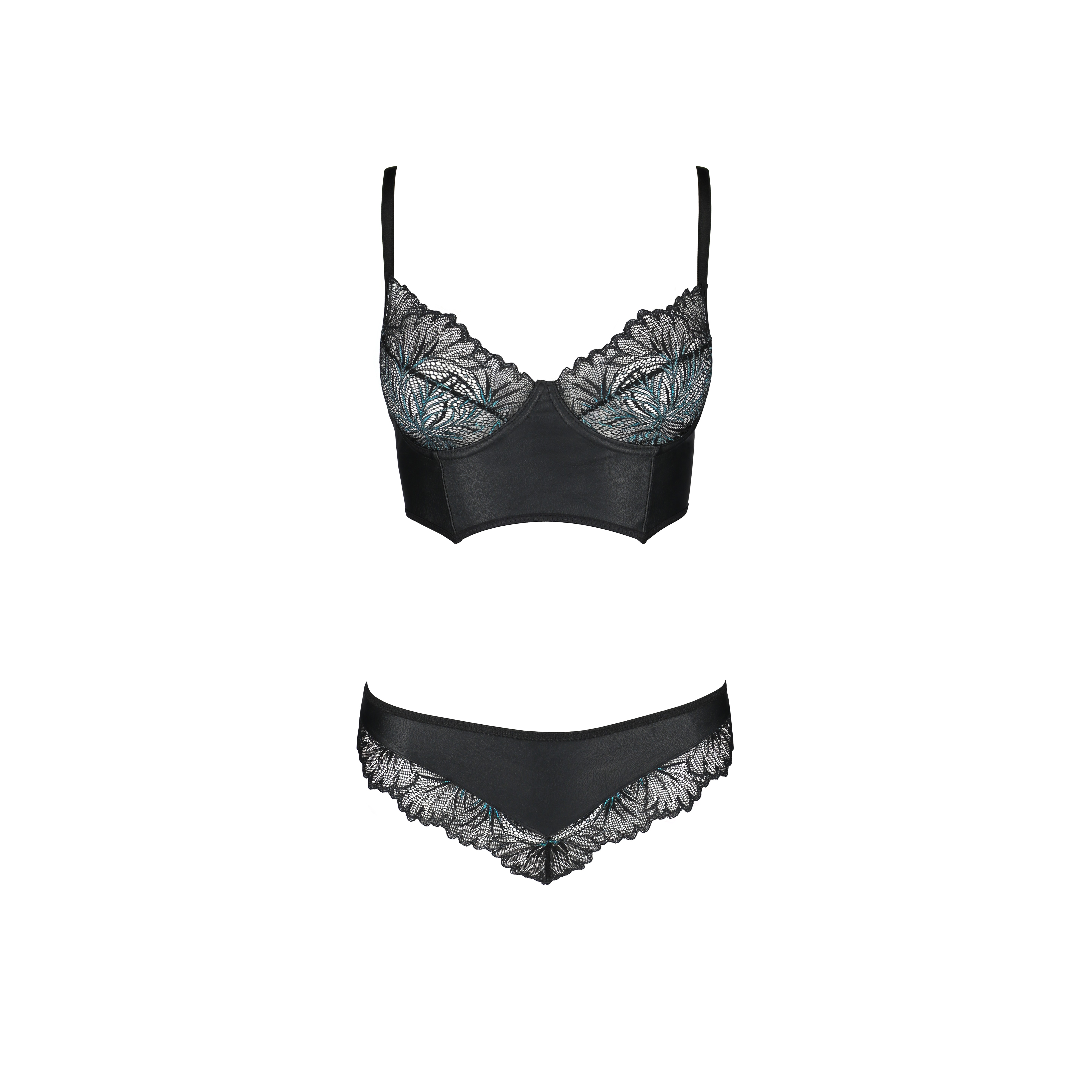 A parte inferior é uma tanga delicada, confecionada em tecido de poliuretano e poliéster, com rendas pretas e detalhes florais verdes, que adicionam um toque de sofisticação.