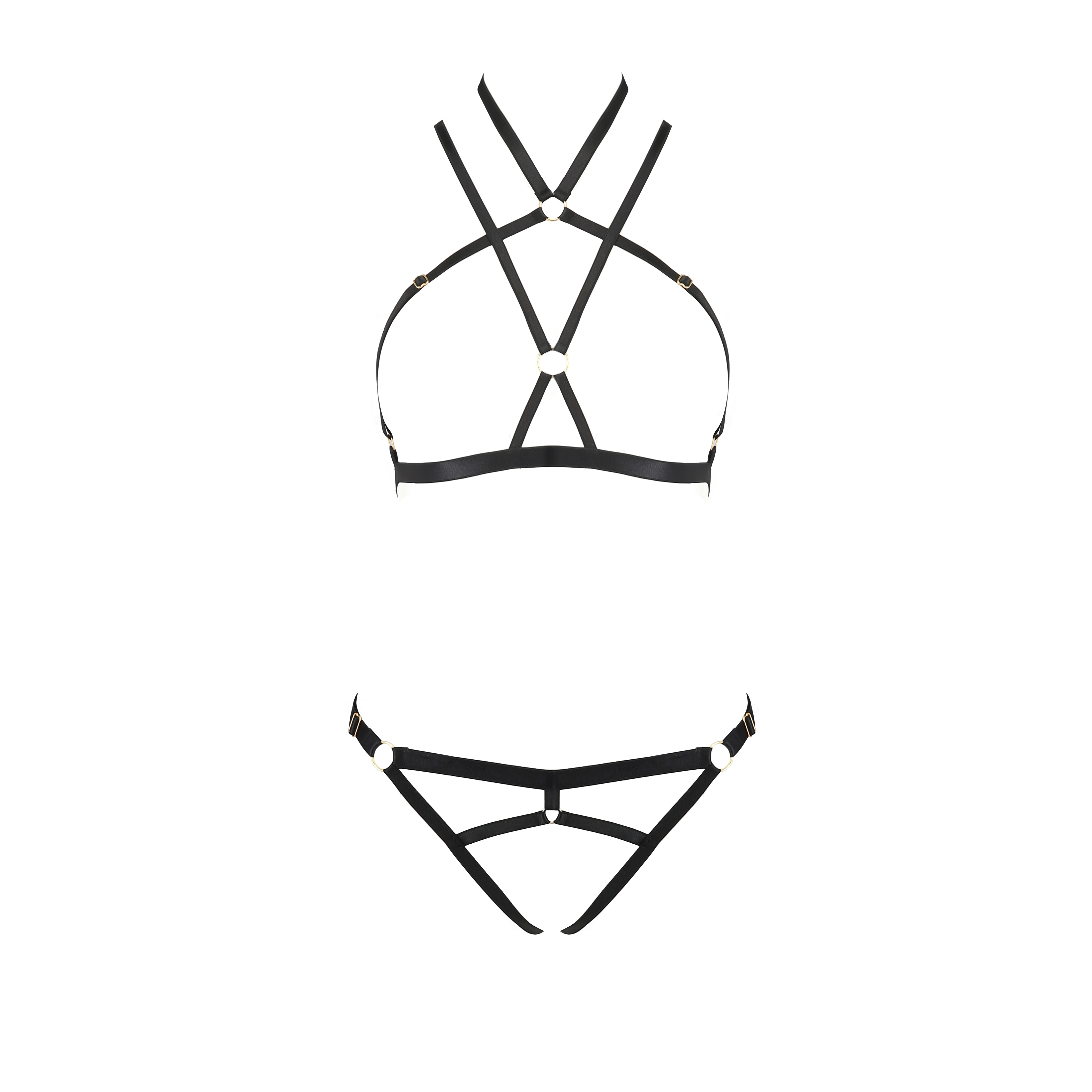 Composto por um sutiã e uma tanga, ambos com um design aberto, este conjunto é perfeito para quem procura ousadia e sofisticação numa só peça.