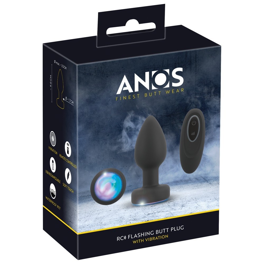 O RC Flashing Butt Plug with Vibration da ANOS conta com uma luz LED colorida e intermitente na base. O seu design clássico e cónico garante uma inserção fácil e um ajuste perfeito, enquanto as vibrações proporcionam uma estimulação intensa. A base de segurança anal torna o plug fácil de manusear e evita que deslize demasiado para o interior. Isto permite que o plug, feito de silicone macio e sedoso, possa ser utilizado confortavelmente durante longos períodos. A luz psicadélica e intermitente ilumina enquanto o plug está inserido.
