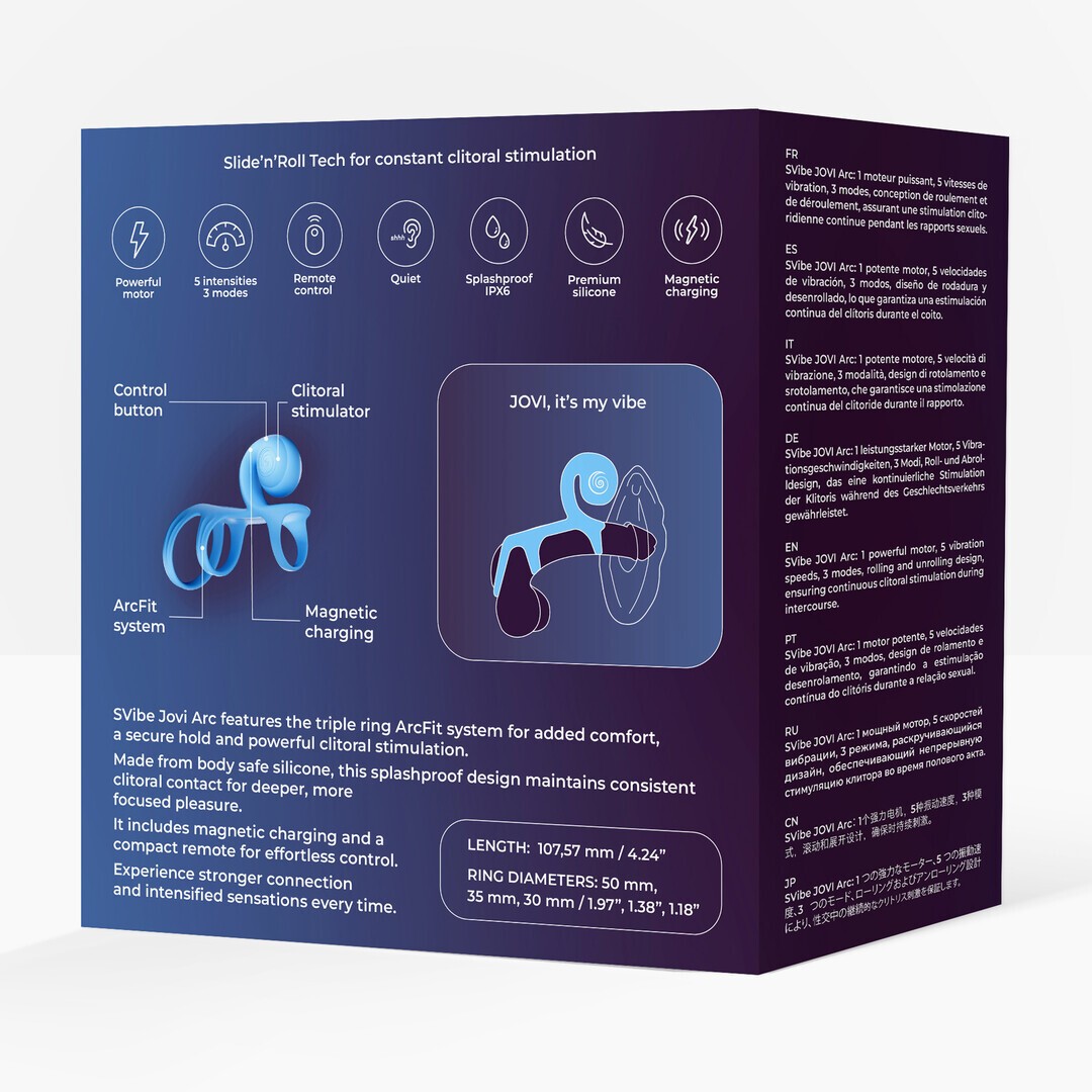 O SVibe Jovi Arc possui o sistema ArcFit de triplo anel, garantindo maior conforto, fixação segura e estimulação clitoriana intensa. Fabricado em silicone seguro para o corpo e à prova de salpicos, mantém um contacto constante com o clitóris, proporcionando um prazer profundo e concentrado.