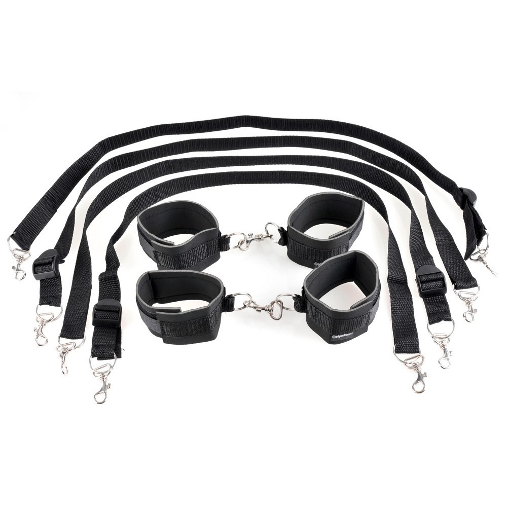 Превратите свою кровать в идеальную сцену для ваших бондажных фантазий. Полный набор для сдерживания с надежными ремнями, наручниками на запястье и лодыжке, регулируемыми для безграничного удовольствия.