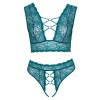 Бюстгальтер и стринги без промежности от Cottelli CURVES в неотразимом комплекте, полностью выполненном из мягкого и нежного кружева в голубовато-синем оттенке. Бюстгальтер имеет глубокий вырез спереди и сзади, соединенный эластичными ремешками и элегантными декоративными кольцами из розового золота. Стринги с высокой талией и без промежности выделяются открытым и смелым вырезом спереди, удерживаемым только кольцами и эластичными ремешками.