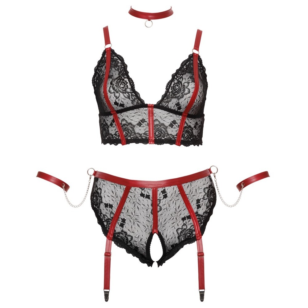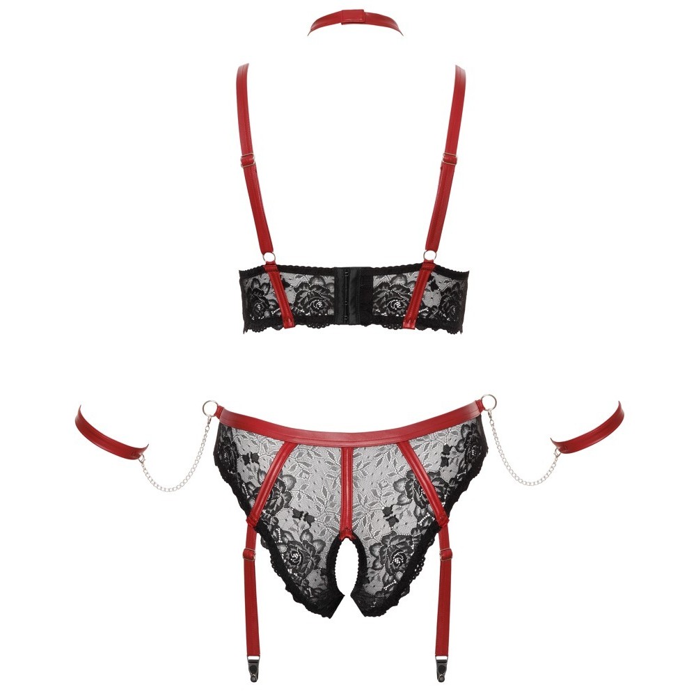 Комплект Cottelli BONDAGE PLUS состоит из бюстгальтера с удлинённым вырезом, стрингов с чулочными ремешками и открытой промежностью, воротника и двух наручников. Нежное эластичное чёрное кружево украшено контрастными деталями матового красного цвета и серебристыми аксессуарами. Бюстгальтер имеет мягкие чашки и регулируемую застежку-крючок сзади, а также регулируемые бретели для удобной посадки. Лямки стрингов также регулируются. Стринги имеют открытый промежность и боковую петлю на талии, к которой можно легко прикрепить входящие в комплект наручники с помощью крючков-защелок. Мягкие наручники регулируются с помощью застежек-крючков и петель. Узкий воротник с кольцом спереди и регулируемой застежкой-крючком и кольцом дополняет этот смелый и соблазнительный образ.