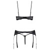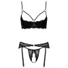 Комплект от Cottelli LINGERIE состоит из бюстгальтера с открытой грудью, пояса для чулок и стрингов без промежности. Все изделия изготовлены из тонкого, мягкого и эластичного черного кружева, бюстгальтер и пояс для чулок украшены блестящими кольцами.