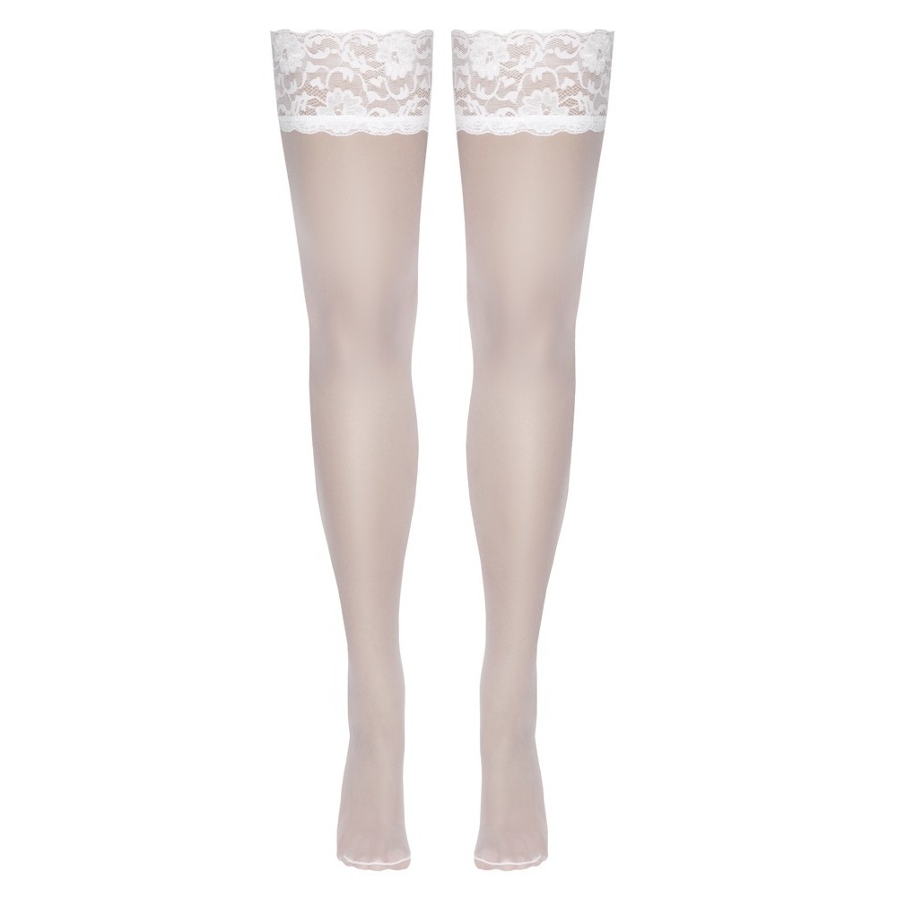 Белые чулки на подвязках от Cottelli LEGWARE с изящной кружевной отделкой шириной 9 см. Внутренняя сторона с силиконовым укреплением для надежной фиксации и идеальной поддержки. Плотность нити 20 ден. Сертификат Oeko-Tex. Дизайн кружева может отличаться от изображенного.