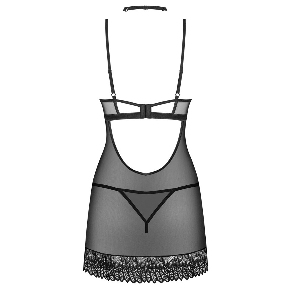 Черный комплект Donarella из 3 предметов от Obsessive включает в себя ночную рубашку, стринги и ошейник. Изготовленный из нежного эластичного тюля с изысканными вышитыми вставками, он мягкий и удобно облегает тело. Ночная рубашка имеет глубокий вырез с вышивкой на чашках и небольшой декоративный элемент между ними, который привлекает внимание. Имеет застежку сзади и регулируемые бретели для идеальной посадки. Стринги выделяются нежными вышитыми вставками спереди и сзади, придавая им чрезвычайно соблазнительный вид. Ошейник, облегающий, но регулируемый, дополняет этот изысканный и чувственный комплект.