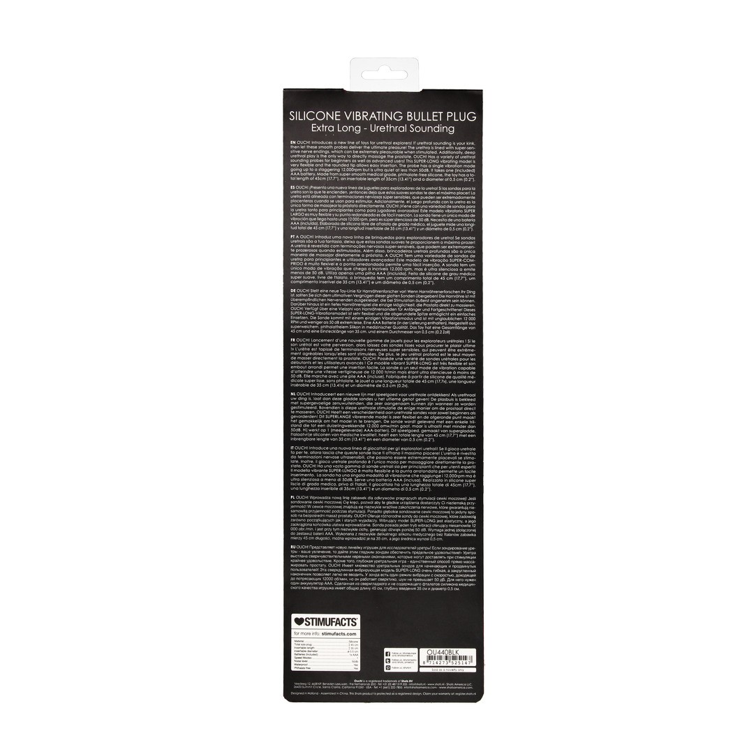 OUCH! Представляет новую линию игрушек для исследователей уретры! Если уретральный зонд - это ваш кинк, то позвольте этим гладким зондам доставить вам максимальное удовольствие! Уретра покрыта сверхчувствительными нервными окончаниями, стимуляция которых доставляет огромное удовольствие. Кроме того, глубокие уретральные игры - единственный способ прямого массажа простаты. ОЙ! Имеет множество зондов с уретральным звуком для новичков и опытных пользователей! Эта вибрирующая модель SUPER-LONG очень гибкая, а закругленный кончик обеспечивает легкое введение. Зонд имеет один режим вибрации, достигающий 12 000 об/мин, но при этом он очень тихий - менее 50 дБ. Работает от одной батарейки ААА (входит в комплект). Изготовленная из супергладкого медицинского силикона, не содержащего фталатов, игрушка имеет общую длину 45 см (17,7), вводимую длину 35 см (13,41) и диаметр 0,5 см (0,2).